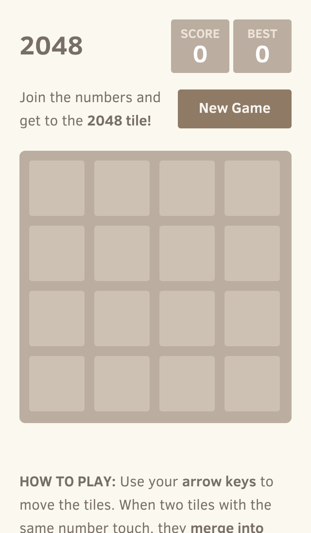 When tiles of the same number collide during a move, they combine into one tile that features the sum of the two merging tiles. After every move, a new tile with the number 2 or 4 will appear in a random spot on the board.